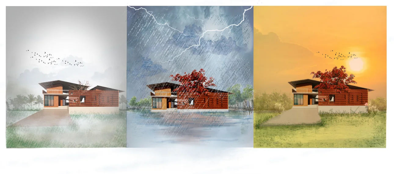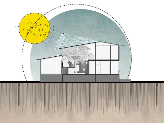 Entire design is consolidated under one roof and organized around naturally ventilated, daylight-driven spaces. shaded thresholds, and cross-ventilation establish a breathable interior environment suited to a humid coastal climate.